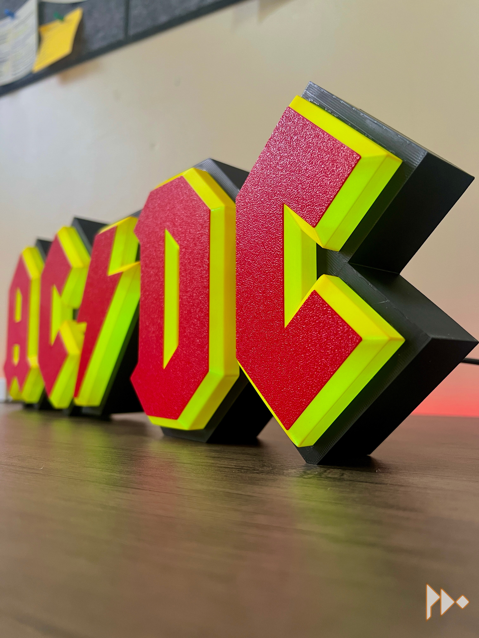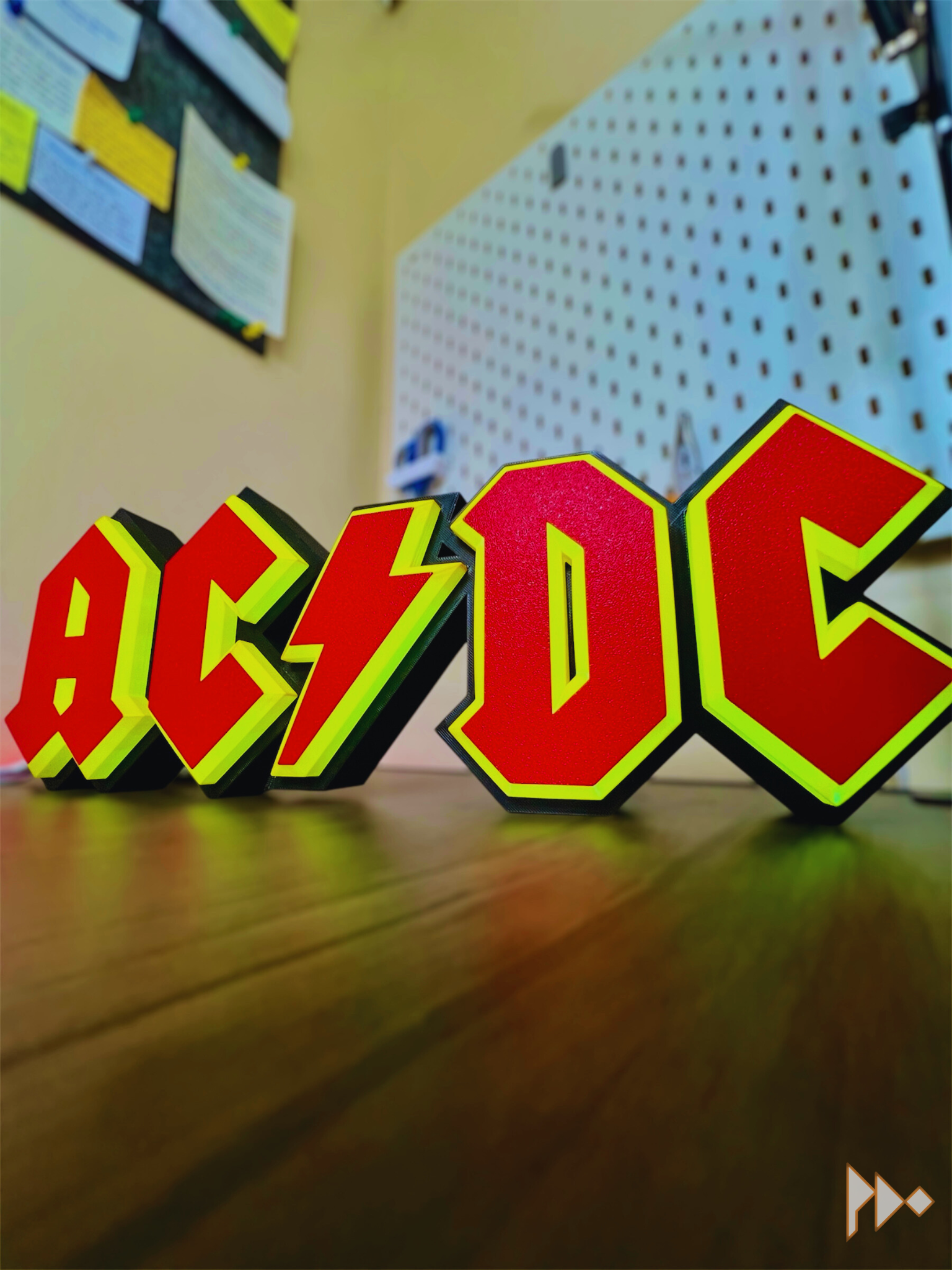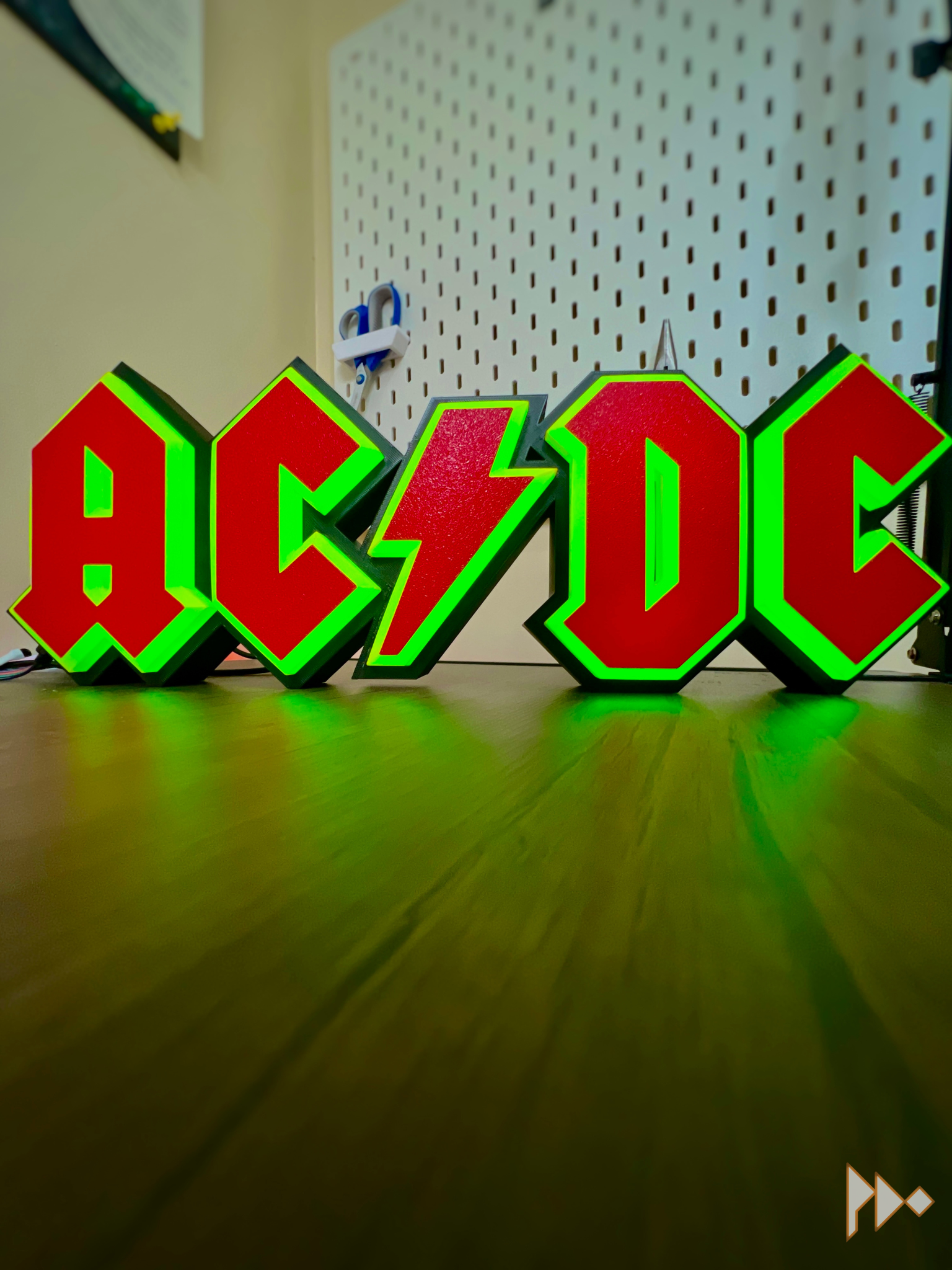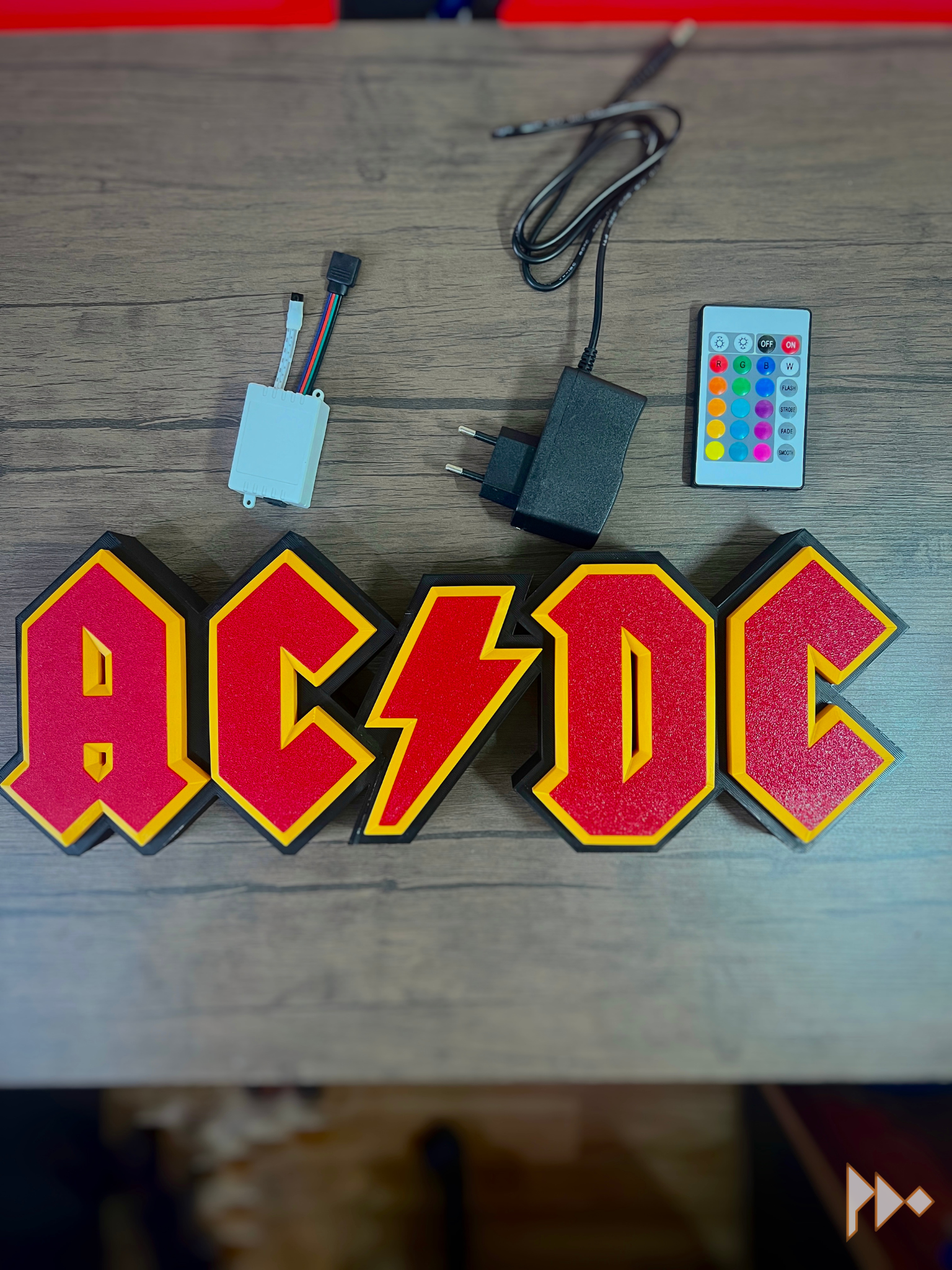 Dale un estilo diferente a tu espacio con este letrero luminoso inspirado en AC/DC. Fabricado con PLA+ y montaje de luces leds RGB, combina diseño moderno con un acabado llamativo que transforma cualquier ambiente.